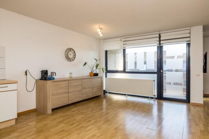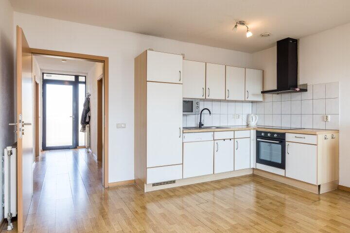 in de open keuken (3,91 x 2,88 mtr.) vinden we een mooie moderne keukenopstelling. de keuken is voorzien van veel kastruimte en de volgende apparatuur: inductiekookplaat (nieuw maart 2022), oven (nieuw maart 2022), afzuigkap en koelkast met vriezer. op de vloer ligt een mooie laminaatvloer, die op de badkamer na, overal in het appartement gelegd is. de ruime woonkamer met een afmeting van ca. 32m2 heeft een speels model.
