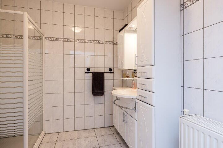 de badkamer is geheel betegeld en voorzien van een douche met glazen douchecabine, een wastafelmeubel met kasten en een wandcloset.